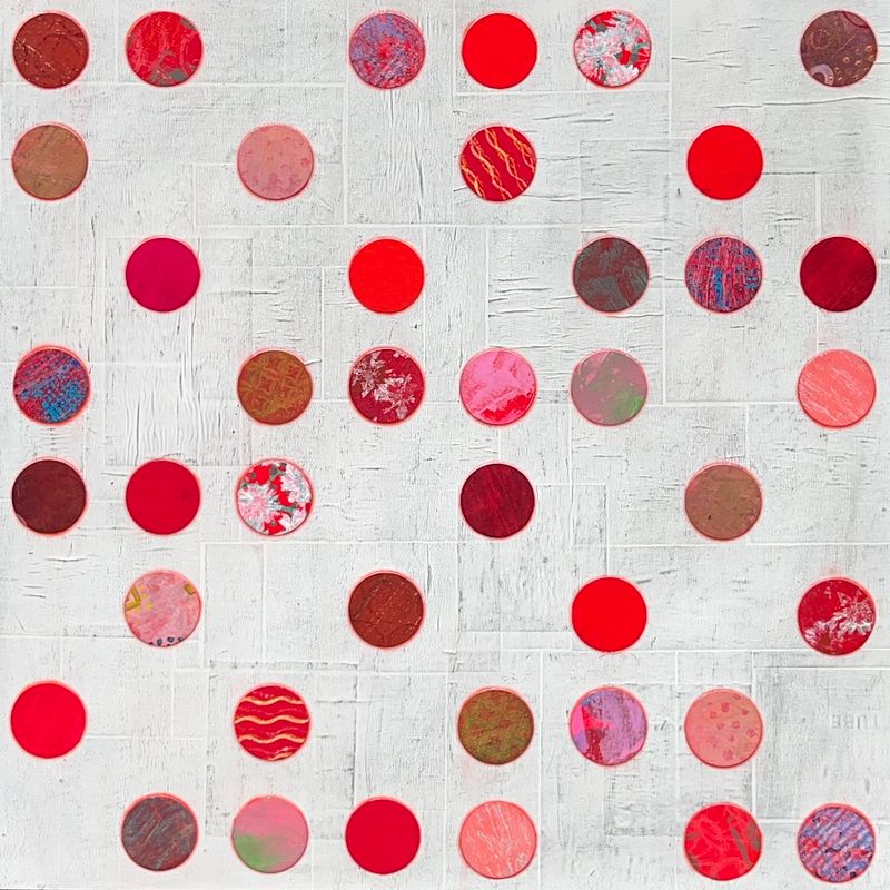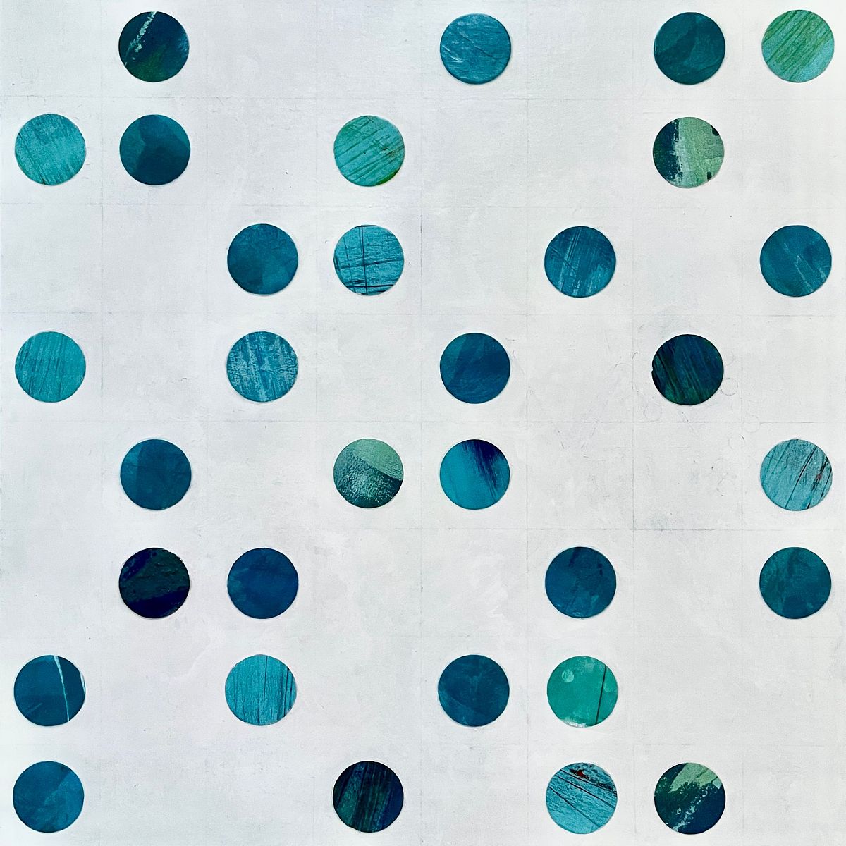 In "Frisson - a sudden surge of excitement; a shiver" delicate turquoise circles emerge against a crisp, minimal background, evoking a sudden surge of energy or emotion. The subtle variations in texture and hue within each circle suggest movement and fleeting moments of excitement. The soft yet striking repetition of shapes creates a rhythm that feels both calm and electric, inviting the viewer to experience that brief, exhilarating shiver that the piece embodies. This work captures the tension between stillness and the thrill of something unexpected, offering a sense of quiet intensity.